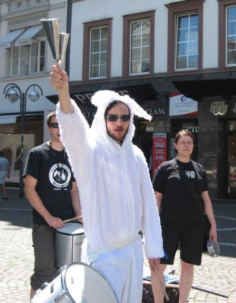 - von Blubb: Als schneeweißes Häschen auf Demo’s tanzend Samba spielen (wir wollen Fotos, wetten?)